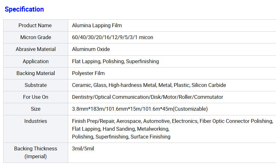 Alumina Lapping Film is made of coating particles micron-grade and sub-micron aluminum oxide abrasives onto a high-strengh polyester film by evenly.The product provides uniform finishes on various substrates and delivers consistent cut rate, finish and life.This product is used for grinding and polishing fiber optic connectors,ceramic, glass, high-hardness metal,motors, disks, dentistry and other fields.