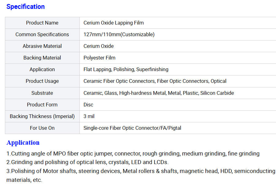 Cerium oxide lapping film is made by uniformly coating sub-micron grade cerium oxide abrasive onto high-strength polyester film, mainly used for precision polishing of single-core fiber optic connector,FA/Pigtail,metal connector inserts,etc.