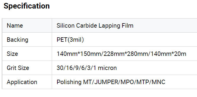Silicon carbide lapping film is made of micron-grade and submicron-grade silicon carbide mineral, evenly coated on high-strength polyester film,and is our standard product for silicon carbide related polishing applications in the fiber optic and metallurgical industries.It provides consistent cut rate, finish and life.This product is mainly used in conjunction with optical fiber grinders and automation equipment for fine grinding of MT/MPO/MTP/Jumper/MNC optical fiber connectors.
